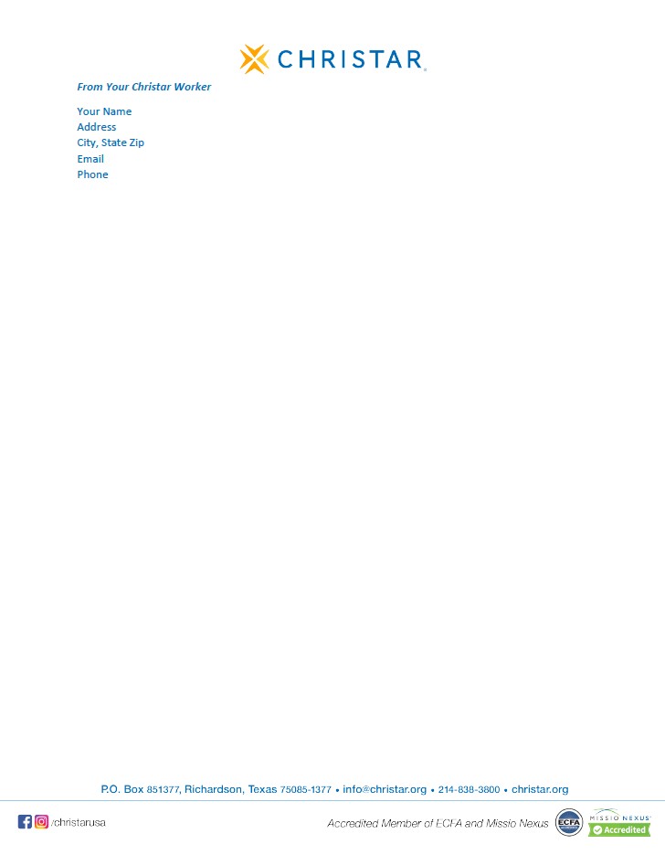 Order this Word document to have a print-on-demand Christar letterhead for correspondence with churches and supporters.