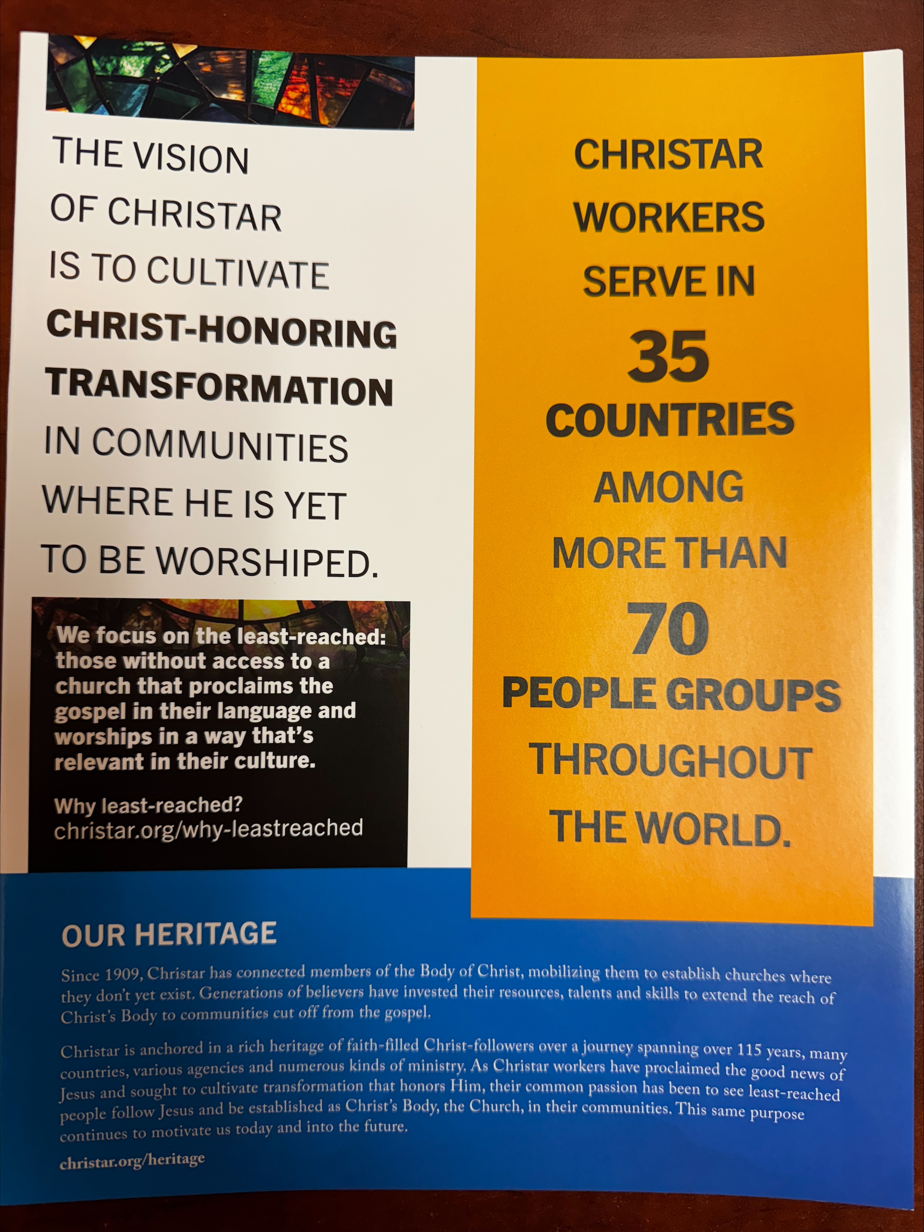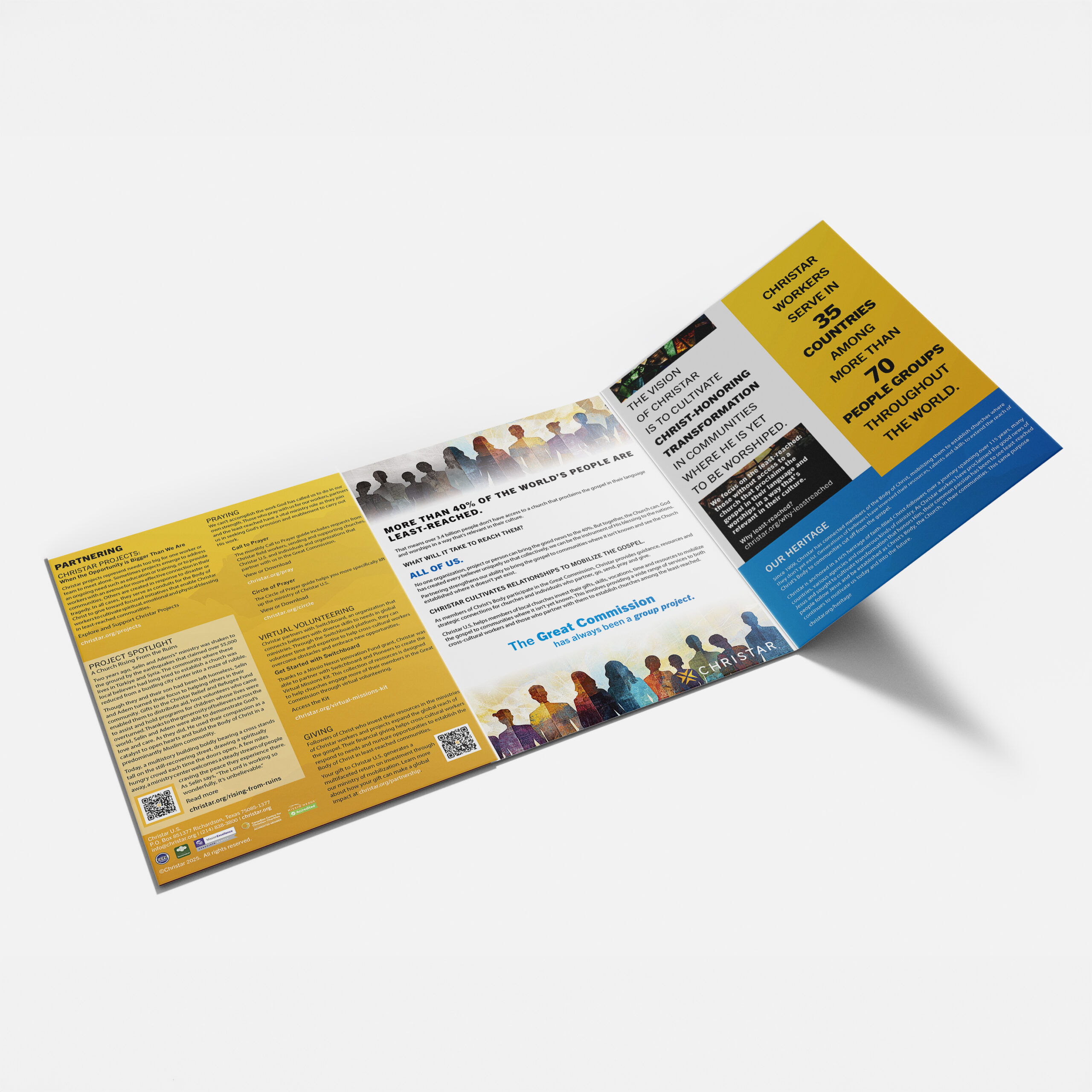 This cover-weight flagship piece folds out from letter-sized to 11″ x 25.5″. It shares who Christar is, how Christar partners with organizations, churches and supporters as well as how readers can get involved and help make Christ known in least-reached communities around the world.